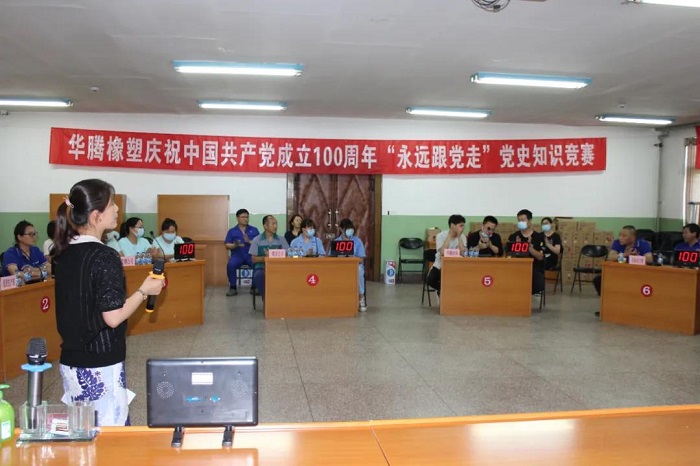6月22日,華騰橡塑公司黨委舉辦“永遠跟黨走”黨史知識競賽?;顒?dòng)旨在以賽促學(xué),以學(xué)促干,激勵廣大黨員干部滿(mǎn)懷信心邁進(jìn)建設行業(yè)領(lǐng)先的科技創(chuàng )新型企業(yè)新征程。此次競賽共有8個(gè)黨支部組隊參加。各黨支部書(shū)記、支部委員、入黨積極分子、共青團員、群眾代表參加活動(dòng),并參與觀(guān)眾答題環(huán)節。