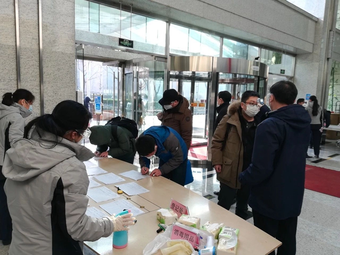 早上8:10,各崗位人員按照前一天下午預案推演的分工,各就各位,各司其職,等待著(zhù)入樓辦公人員高峰的到來(lái)。大廈員工身著(zhù)工裝,佩戴手套、口罩和護目鏡,分列于兩個(gè)側門(mén)入口,有的做好入門(mén)信息登記,有的手持測溫儀挨個(gè)測體溫,有的在門(mén)口引導人員分高層和底層兩個(gè)口入樓。