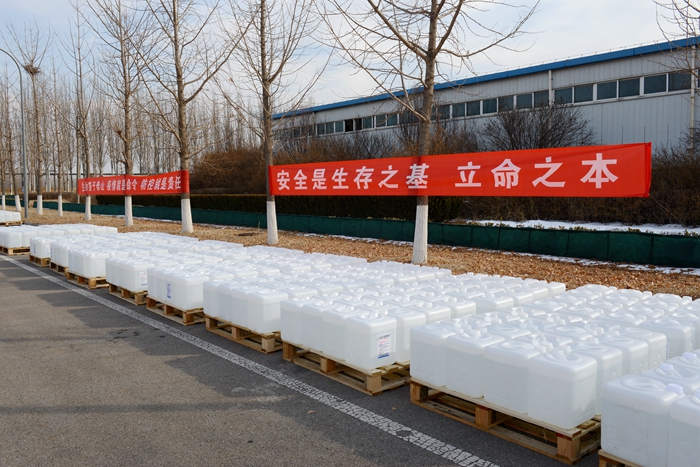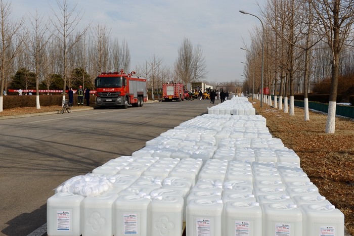 根據用戶(hù)反饋的需求信息,經(jīng)市物資保障組決定,將25L大包裝調整為500ML/瓶小包裝,北化集團承擔相關(guān)卸貨、進(jìn)庫、儲存、配送任務(wù)。由華騰化工公司倉儲事業(yè)部、安全生產(chǎn)部、保衛部、公用工程事業(yè)部20名同志負責卸貨入庫。