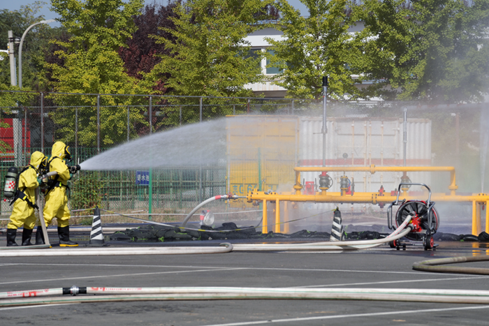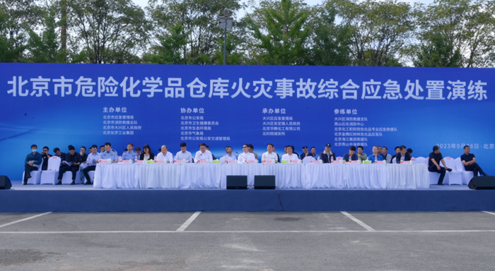 警笛鳴響、水龍騰空。在中秋、國慶 “雙節”到來(lái)之際,9月28日上午,北京化工集團華騰科技園區(原大興化工園區)被緊張而嚴肅的氛圍所縈繞。由北京市應急管理局、北京市消防救援總隊、北京市大興區人民政府和北京化工集團主辦,大興區應急管理局、大興區安定鎮人民政府、華騰化工和北科院城安所承辦的北京市危險化學(xué)品倉庫火災事故綜合應急處置演練正在這里舉行,150余人參加演練。