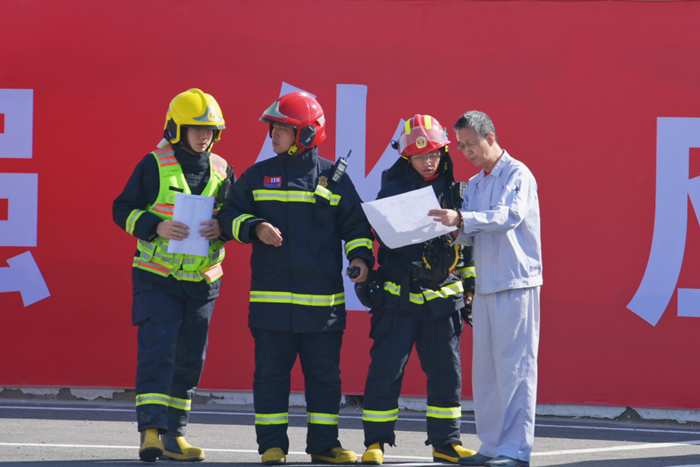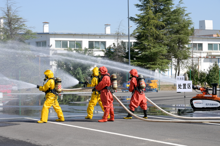 演練緊張而有序,周邊有毒有害氣體濃度監測和偵檢、事故現場(chǎng)火災撲救、空氣中可燃氣體和有毒有害氣體濃度稀釋、泄漏危險化學(xué)品輸送管道堵漏……環(huán)環(huán)相扣、環(huán)環(huán)跟進(jìn)。