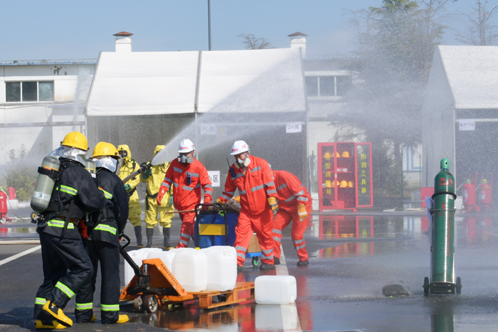 本次演練以華騰化工危險化學(xué)品儲存庫房?jì)Υ娴谋鸹?,引發(fā)了一系列的衍生事故,導致事故逐漸升級為背景,選取危險化學(xué)品倉庫事故典型場(chǎng)景作為本次演練主要科目。