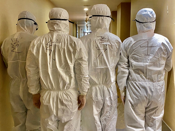 這樣的默默堅守,在我們一線(xiàn)服務(wù)人員身上更得到充分彰顯。在紅區工作的13名服務(wù)人員,每天要穿著(zhù)厚厚的防護服為集中觀(guān)察人員送餐、送物品、搞清潔衛生。每天,他們要全副武裝穿上防護服,并嚴格按照要求進(jìn)行消殺。要一個(gè)房間一個(gè)房間地配送餐食,送餐完畢,還要一個(gè)房間一個(gè)房間地收納垃圾。由于防護服不透氣,剛一行動(dòng)起來(lái),他們已經(jīng)渾身是汗,但是他們每次都保質(zhì)保量按時(shí)完成了任務(wù)。請記住他們的名字:崔濤、陳宇、翟明星、于艷梅、任艷麗、吳迪、崔加倫、劉克云、孫家俊、單雪芳、杜迪、楊魯琦、侯迪。
