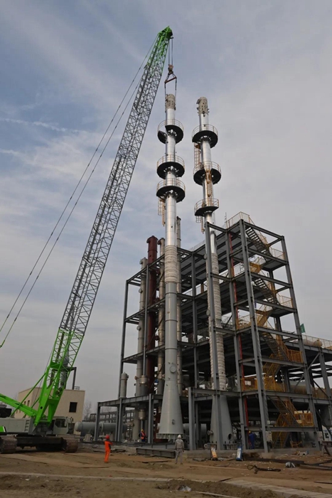 兩座精餾塔中的單體精餾單元,高達48米,是PAE(聚芳醚)項目最高裝置。為高質(zhì)量完成吊裝任務(wù),京騰昊樺干部職工統一協(xié)調,相繼完成了基礎復核、標高復核、吊裝位置復核等前期工作,并同步完成保溫層、爬梯和平臺的安裝。