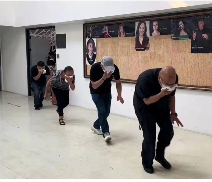 突然出現的“火情”讓辦公大樓“濃煙滾滾”,隨著(zhù)警報的響起,只見(jiàn)辦公人員用濕毛巾捂住口鼻,放低身位,沿著(zhù)消防通道指示標志魚(yú)貫撤出辦公大樓……