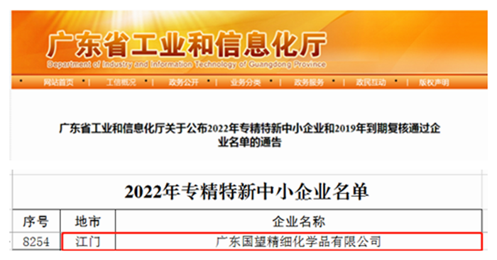 春節前夕,從廣東傳來(lái)好消息,華騰新材所屬廣東國望精細化學(xué)品有限公司成功入選廣東省2022年“專(zhuān)精特新”中小企業(yè)名單,成為北京化工集團第6家“專(zhuān)精特新”企業(yè)。
