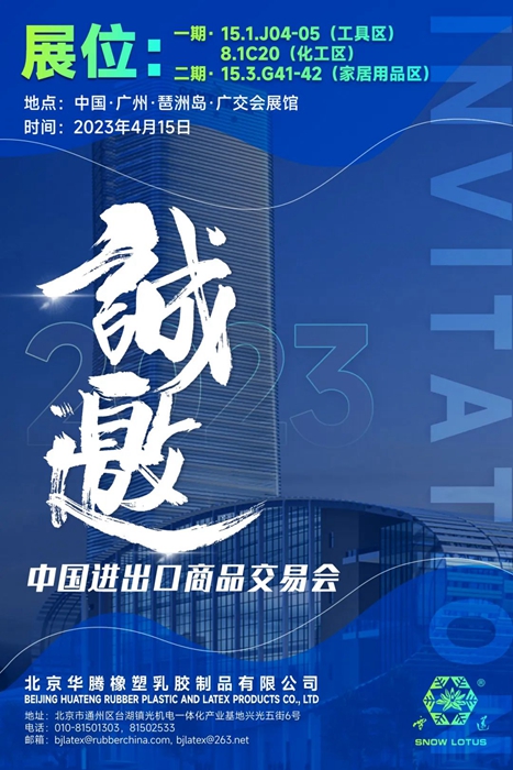 華騰橡塑繼4月15日至19日在工具區、化工區參加第一期廣交會(huì )后,于4月23日至27日將在第二期家居用品區設有展位。在此恭候您的到來(lái)。